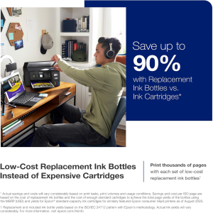 Epson strongly recommends the use of genuine ink to ensure optimal print quality and performance. Use of non-genuine ink could cause damage not covered under the printer’s ltd. wnty. | 1. Actual savings and costs will vary considerably based on print tasks, print volumes and usage conditions. Savings and cost per ISO page are based on the cost of replacement ink bottles and the cost of enough standard cartridges to achieve the total page yields of the bottles using the MSRP (USD) and yields for Epson standard-capacity ink cartridges for similarly featured Epson consumer inkjet printers as of March 2024. | 2. Individual cartridges estimate based on print yields of an included or replacement set of black and color ink bottles as compared to Epson standard-capacity ink cartridges for similarly featured printers as of March 2024. | 3. Part of the ink from the included bottles is used for initial setup; yields are lower than those of replacement ink bottles. Replacement and included ink bottle yields based on the ISO/IEC 24712 pattern with Epson’s methodology. Actual ink yields will vary considerably for reasons including images printed, print settings, temperature and humidity. Yields may be lower when printing infrequently or predominantly with one ink color. All ink colors are used for printing and printer maintenance, and all colors must be available for printing. For more information, visit www.epson.com/inkinfo | 4. Based on average monthly document print volumes of about 125 pages. | 5. See www.epson.com/voice for device compatibility. Epson Connect™ account and voice-activated account registration required. | 6. Most features require an Internet connection to the printer, as well as an Internet- and/or email-enabled device. For a list of Epson Connect enabled printers and compatible devices and apps, visit www.epson.com/connect | 7. Requires Epson Smart Panel app download. Data usage fees may apply.