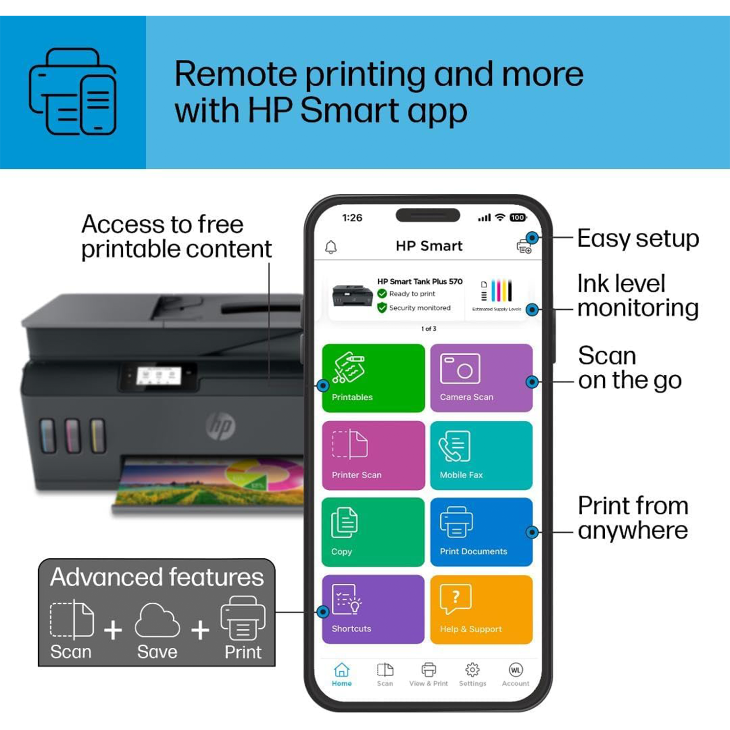 | Included Components | 5HX14A HP Smart Tank Plus 570 Wireless All-in-One printer; HP 32XL 135-ml Black Original Ink Bottle; HP 31 70-ml Cyan Original Ink Bottle; HP 31 70-ml Magenta Original Ink Bottle; HP 31 70-ml Yellow Original Ink Bottle; HP Black Printhead; HP Tri-color Printhead; Ink caution flyer; Repacking flyer; Setup guide; Reference guide; Regulatory flyer; Power cord |