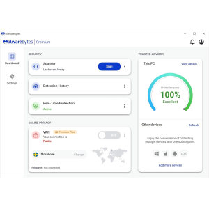 Malwarebytes Premium Security (Standard subscription) protects against malware, including viruses, ransomware, and spyware, without slowing you down. It removes any existing infections and proactively prevents future ones. It also defends against phishing scams, fake or malicious websites, infected ads, credit card skimmers and credential stealers. Expand your protection to your other devices- computers, smartphones, or tablets.